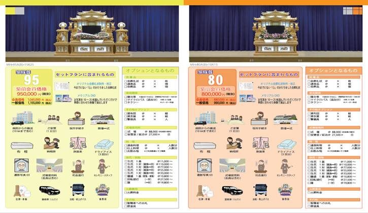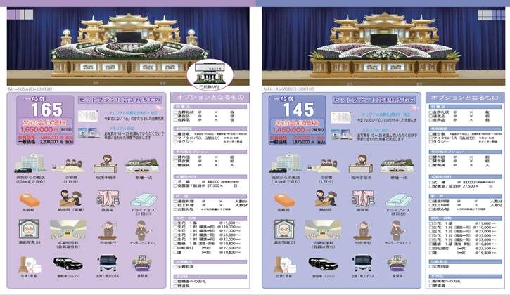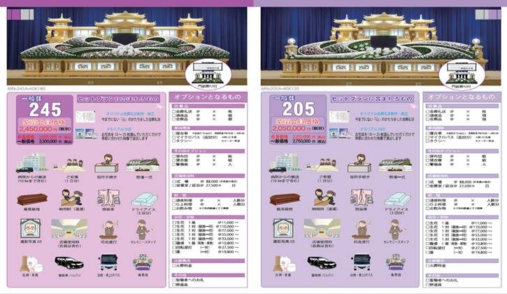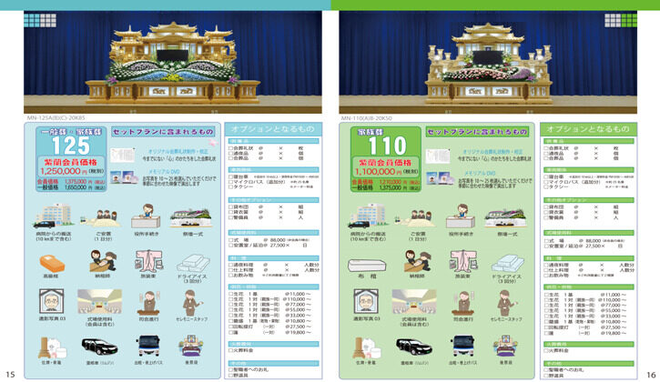 「礼状・粗品・貸衣装・貸布団(5組セット)・安置室1日27.500円(税込)・寝台(10㎞以上は毎5.500円「税込」夜間は二割増し)・寺院タクシー・供花供物・料理/飲料・火葬料・宗教者へのお礼」