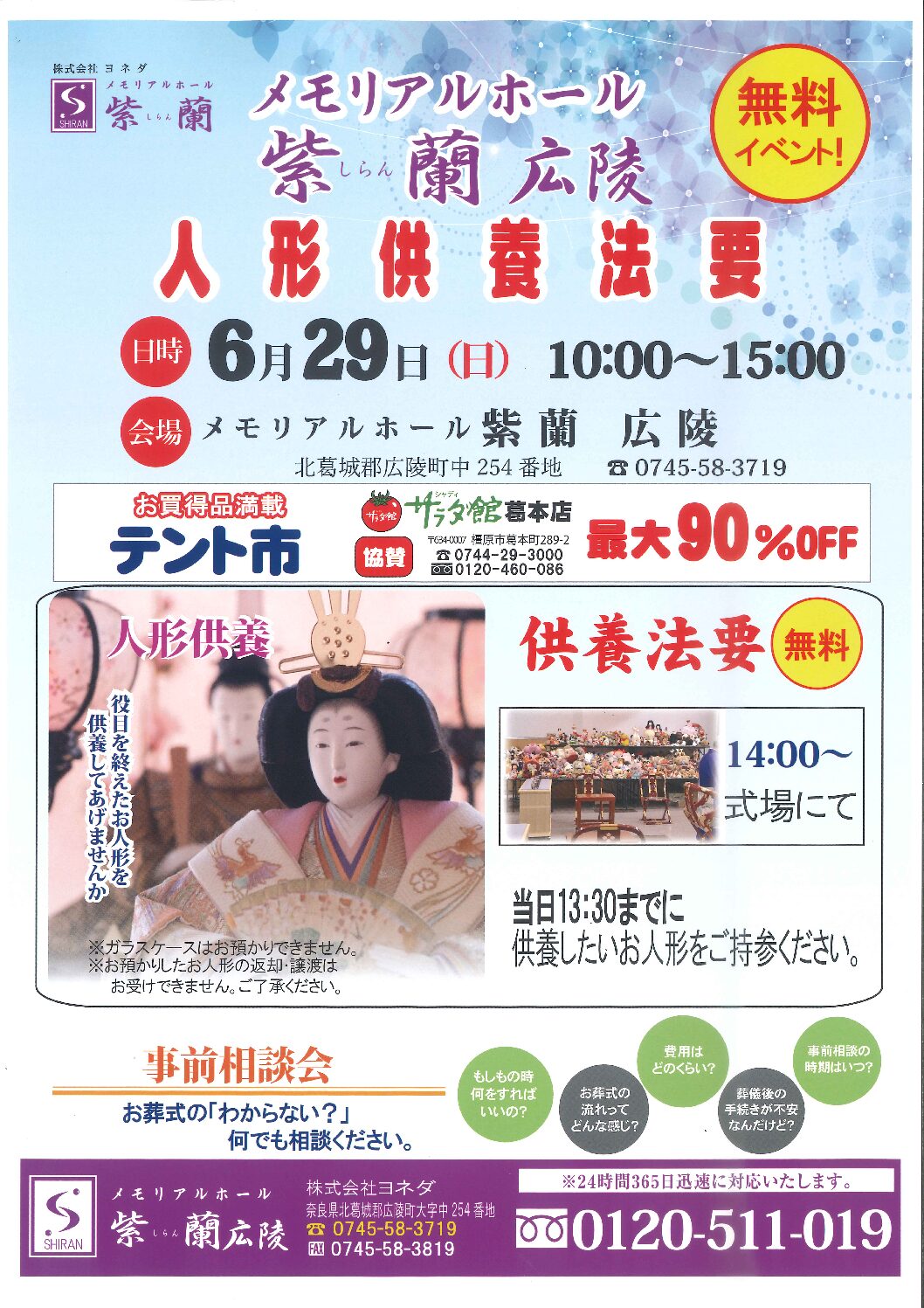 人形供養 平素より、紫蘭をご利用いただき、誠にありがとうございます。 このたび、令和7年6月29日(日)メモリアルホール紫蘭・広陵にて、サラダ館のテン…