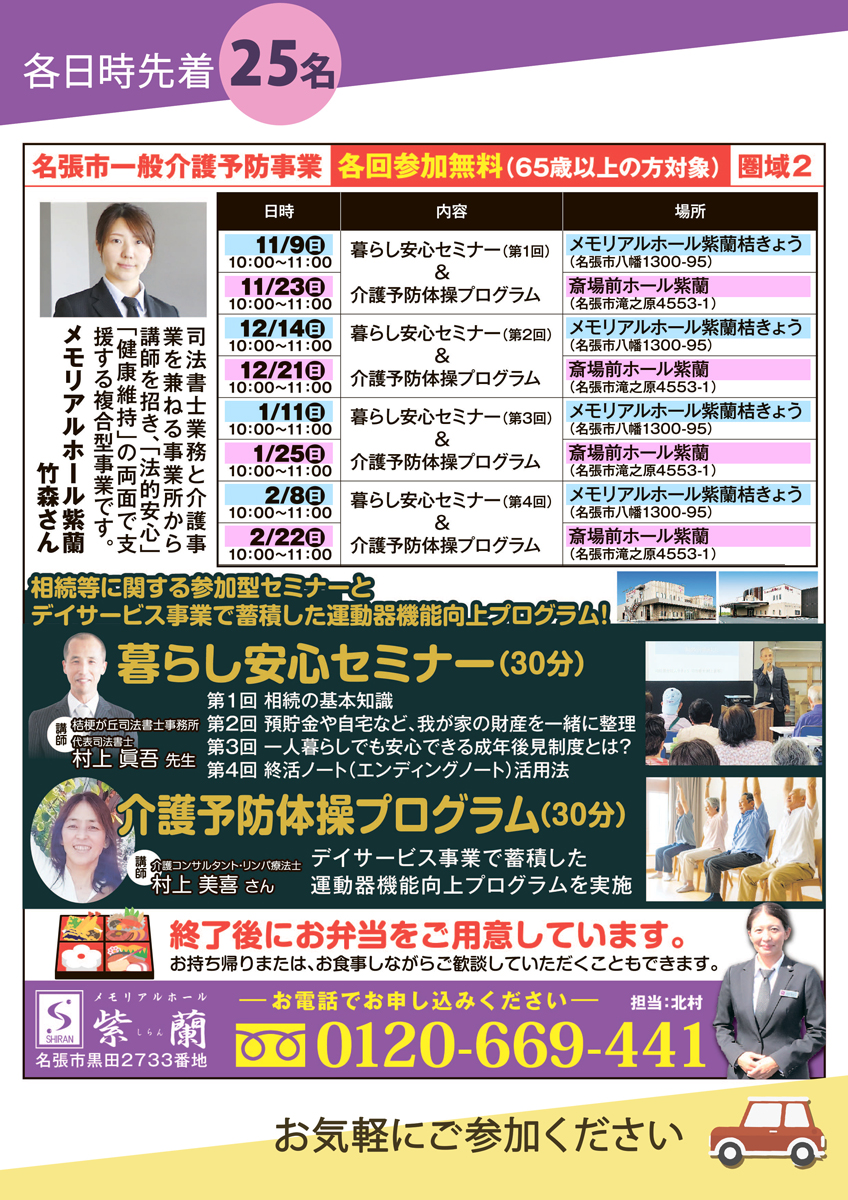 各日時、先着25名様無料(65歳以上の方対象)となります。 皆様のご参加をお待ちしております。