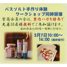 バスソルト手作り体験ワークショップも3月7日同時開催 紫蘭会員様は案内ハガキ持参で先着50名様無料でバスソルト手作り体験が出来ます。 追加作品は500…